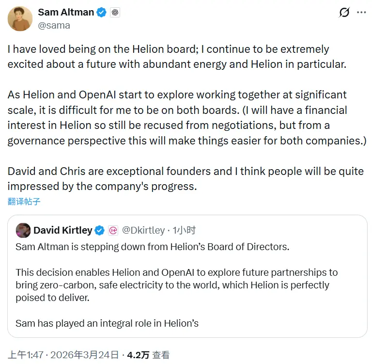 北京时间周二凌晨,OpenAI首席执行官山姆·奥尔特曼确认,由于他投资的聚变能源初创公司Helion正在与OpenAI开始探索“开展大规模合作”,他将辞去Helion董事长一职。