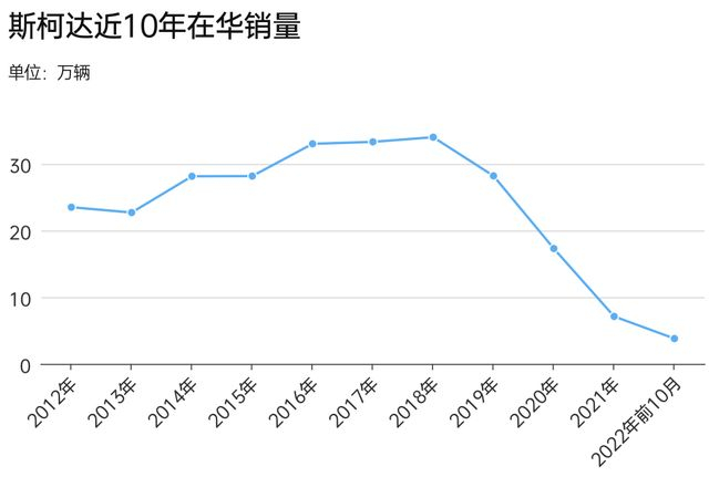 2019-2021 年,斯柯达年销量几乎逐年腰斩,分别为 28.2 万辆、 17.3 万辆和 7.12 万辆。