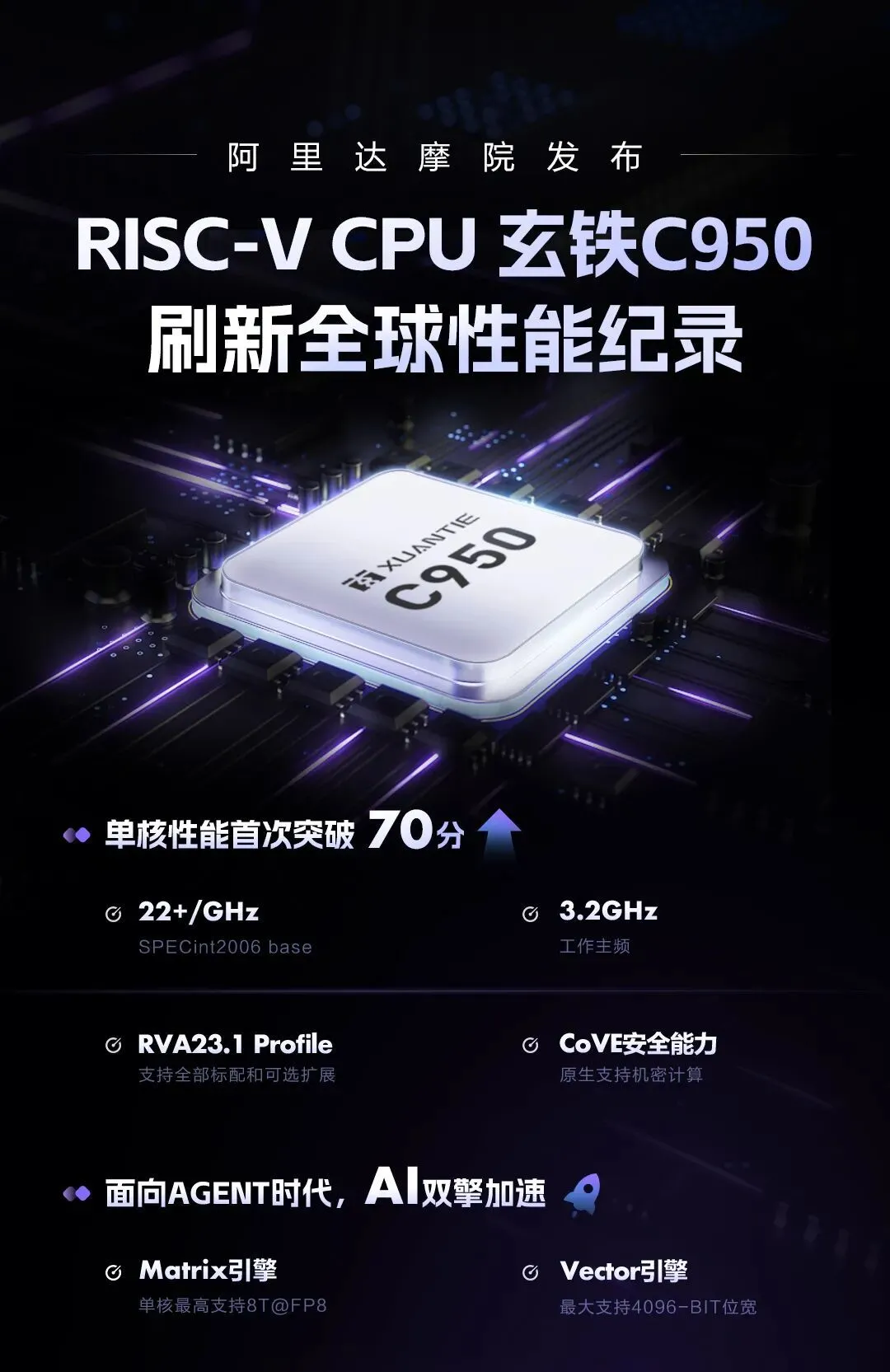 据达摩院消息,在上海举行的2026玄铁RISC-V生态大会上,阿里巴巴达摩院发布新一代旗舰CPU产品玄铁C950。其采用开源RISC-V架构,单核通用性能在Specint2006基准测试中突破70分,刷新全球RISC-V性能纪录。相较玄铁C920综合性能提升3倍以上,访存带宽提升超4倍。适用于云计算、生成式AI、高端机器人、边缘计算等领域。