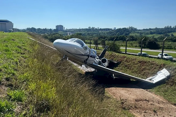 当地时间2026年3月15日上午,一架塞斯纳奖状550(Cessna Citation 550)公务机在巴西圣保罗州容迪亚伊的罗利姆·阿道夫·阿马罗州立机场着陆时发生意外,冲出跑道后坠入跑道尽头的深沟,飞机损毁严重。