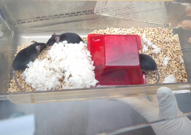 第一窝小鼠整体比较“社恐”,总喜欢把棉花堵入红房子,把自己严严实实藏在里面,很少出来活动;