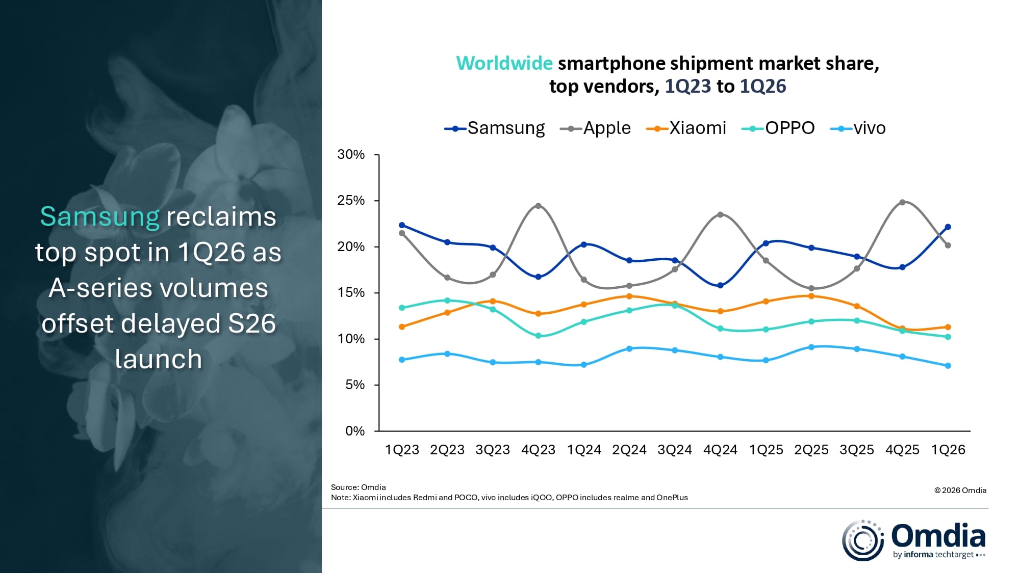 三星以22%的市占率位居全球第一,Galaxy S26系列市场表现强劲,推动份额同比提升。