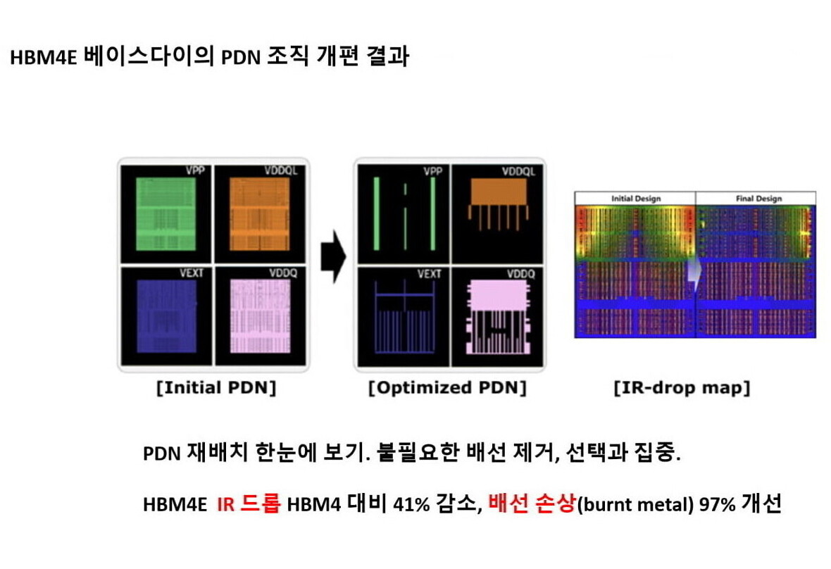为破解这一供电瓶颈,三星选择从电源网络结构本身“开刀”。在HBM基底芯片上,原本位于互连中介层(interposer)附近、呈大面积蜂窝状的集中式MET4电源块被拆分成四个较小分区,上层金属布线层也进一步打散,缩短关键路径、缓解局部走线拥堵。三星给出的内部评估显示,经由这种分段式电源网络后,金属电路缺陷发生率相比HBM4下降了97%,同时IR压降改善幅度达到41%,为芯片在更高频率下稳定运行释放出更多电压裕量,也有助于整体可靠性提升。