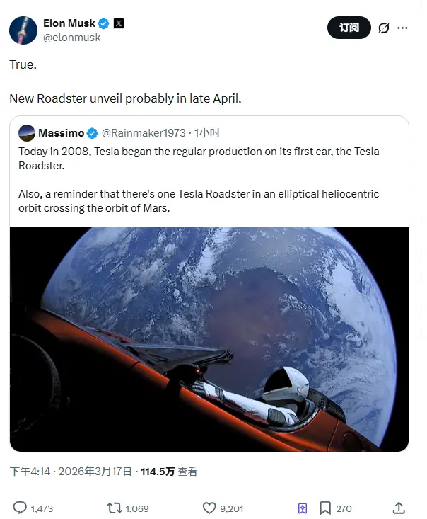 3月17日,特斯拉首席执行官埃隆·马斯克今日通过社交平台X对外透露,旗下新款Roadster电动跑车预计将于四月下旬正式发布。这一最新表态意味着,该车型的实际亮相节点较此前规划的4月1日有所推迟。