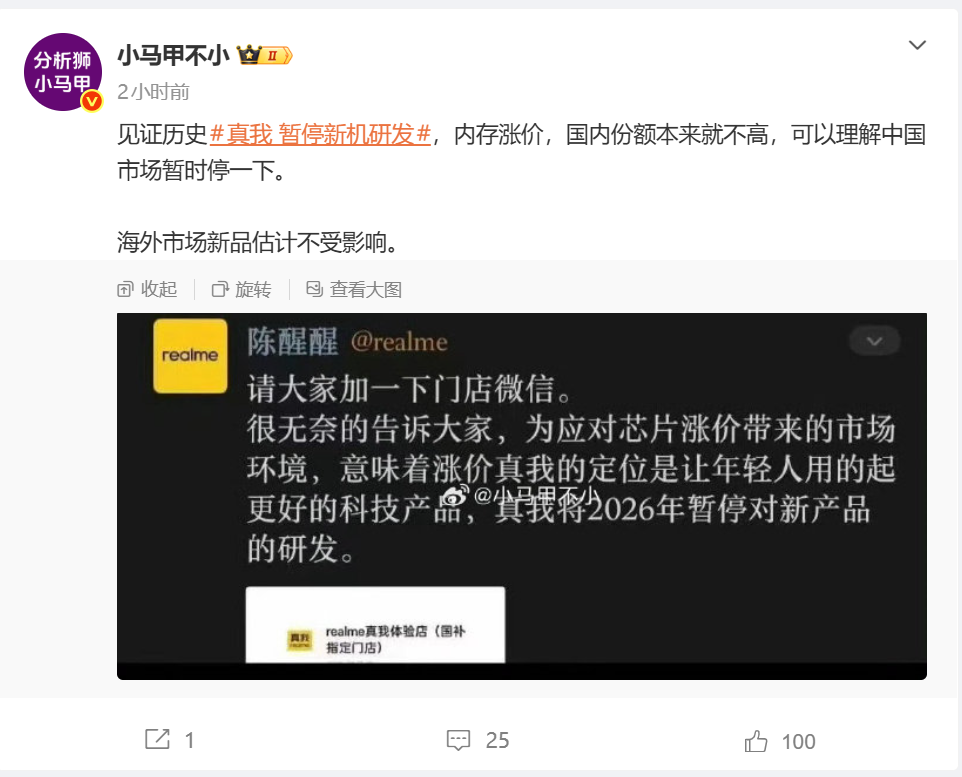 今天,博主“小马甲不小”发文分享了一张realme真我工作人员的公告。ID为“陈醒醒”的realme工作人员在公告中表示,很无奈的告诉大家,为应对芯片涨价带来的市场环境,意味着涨价真我的定位是让年轻人用的起更好的科技产品,真我将2026年暂停对新产品的研发。