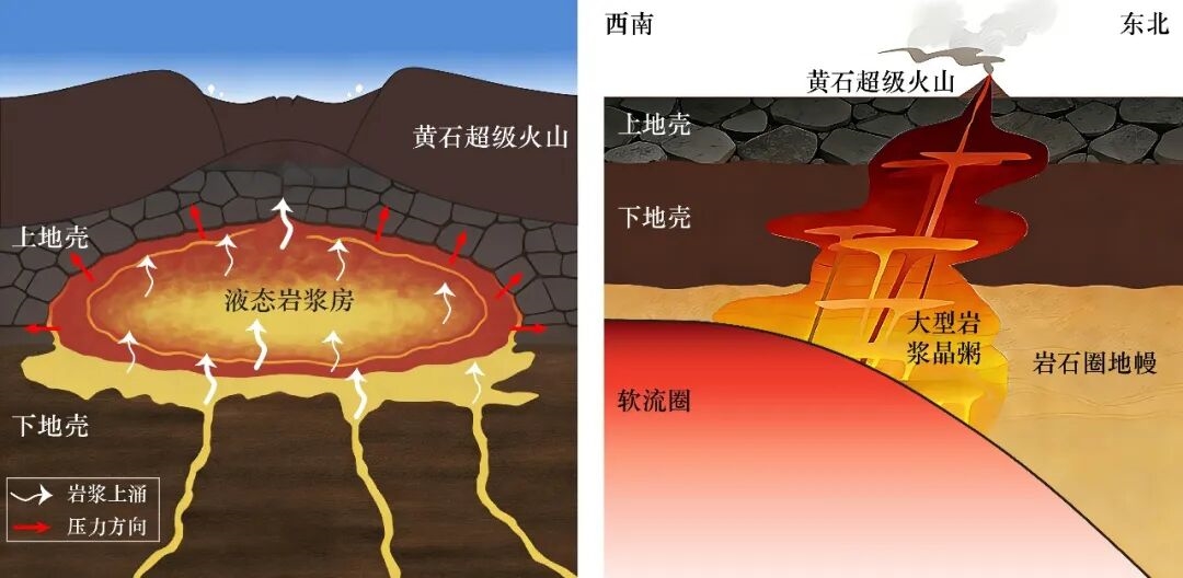 左侧:传统地壳岩浆房观点下的黄石超级火山岩浆系统示意图。