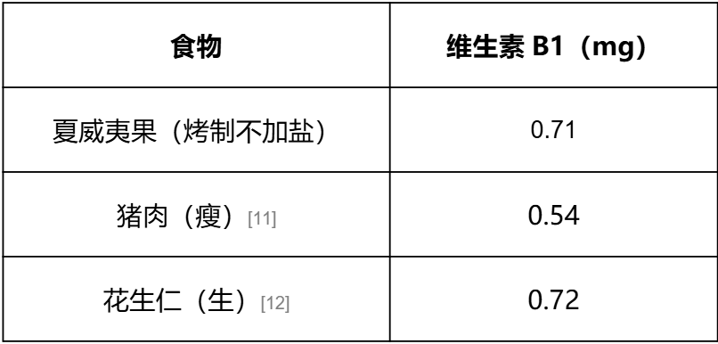 一提到富含维生素 B1 的食物,作为营养工作从业者,我会立马想到瘦猪肉和花生。但看了夏威夷果的数据发现,每 100 g 的夏威夷果含维生素 B1 为 0.71mg,高于大多数坚果,而且含量与标杆食物花生相当,比瘦猪肉的含量还要高。