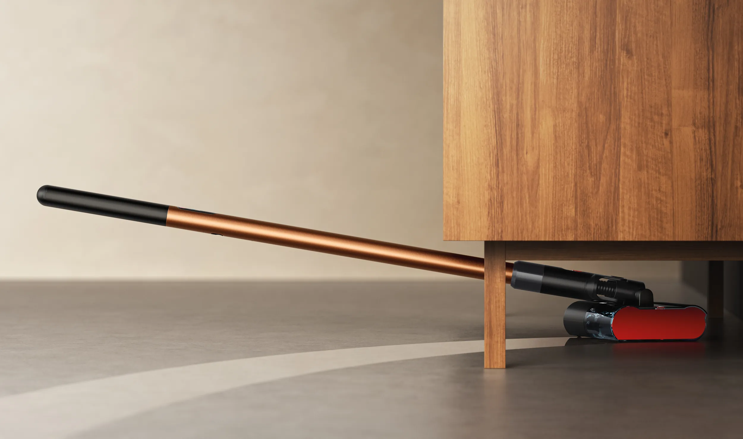 PencilWash 的一大卖点仍然是机身纤细与高机动性。其可旋转手柄几乎可以完全放平,使机身能贴地滑入沙发、床底等低矮家具下方进行清洁,解决传统立式洗地机难以深入的卫生死角问题。戴森强调,PencilWash 依托加压供水系统,将清水精准输送到滚筒上,通过高密度纤维结构完成擦洗,再将污水回收至污水通道,实现“前洗后吸”的一体化流程。