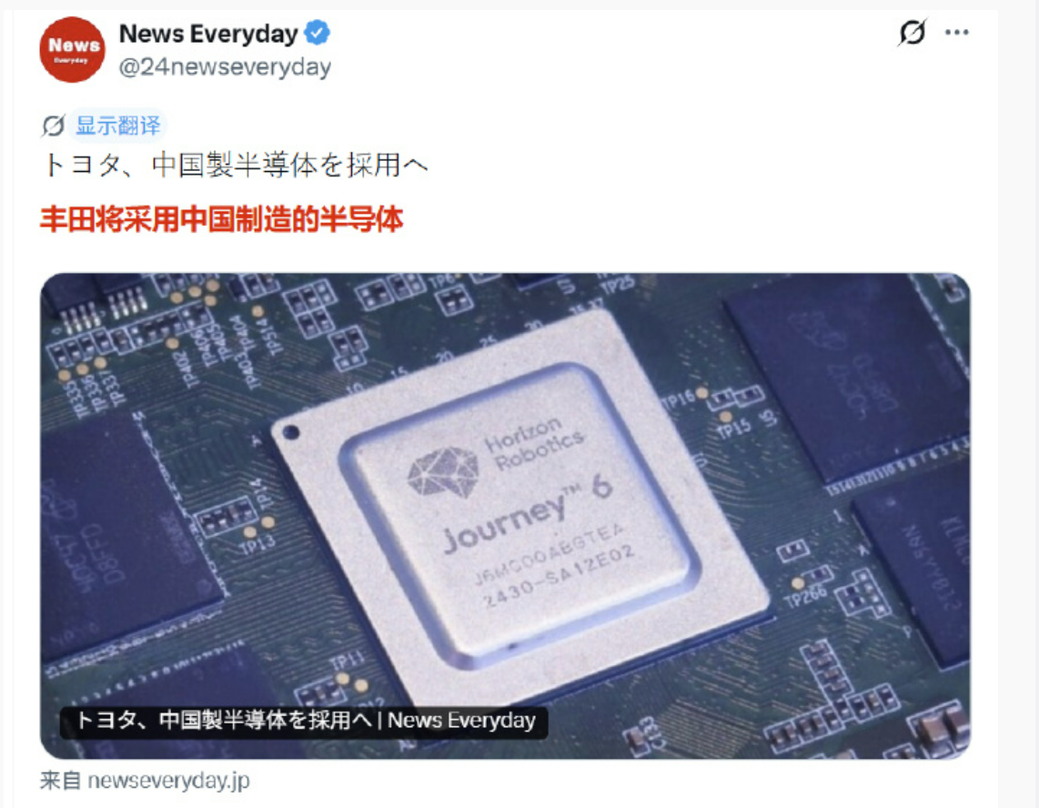 现在中国的芯片正在获得越来越多外企的认可和采用,比如丰田和铃木等已经选择加入。据日本媒体报道称,丰田汽车和铃木将在中国以外地区销售的车辆上,采用中国车载半导体新兴企业——地平线机器人(Horizon Robotics)研发的SoC(系统级芯