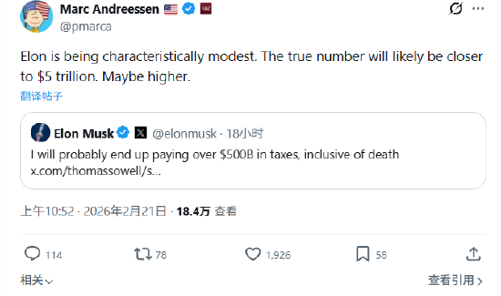 马斯克周四在X上发帖称:“我最终可能要缴纳超过5000亿美元的税款,包括死亡税。”风投大佬马克·安德森回应称:“埃隆一如既往地谦虚。实际数字可能接近5万亿美元,甚至更高。” 阅读全文