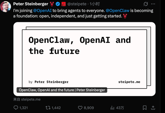 春节是个好日子,AI Agent 圈迎来一则重磅人事变动。没想到吧,OpenClaw(前身 Clawdbot / Moltbot)从爆火到加入 OpenAI,仅仅过去了一个月的时间。就在刚刚,OpenClaw之父Peter Steinber