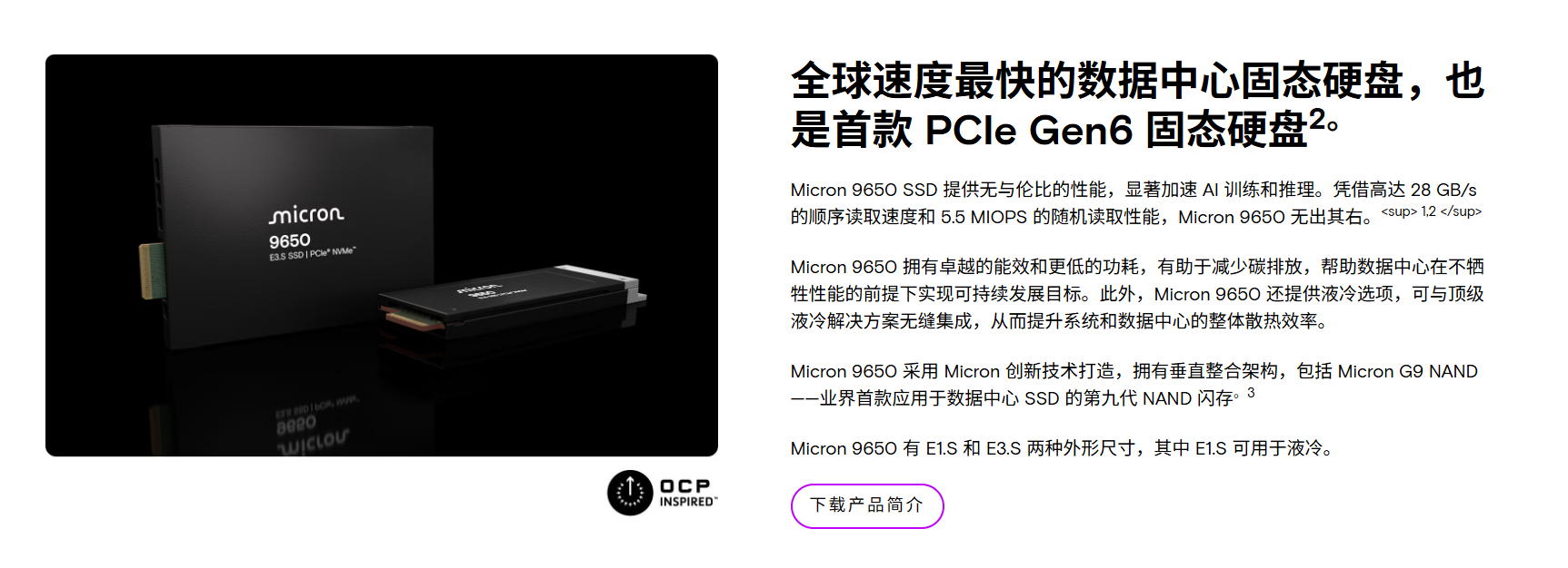 美光科技正式宣布量产全球首款面向数据中心的PCIe Gen6存储解决方案 ——9650 NVMe SSD,该产品以28GB/s的顺序读取速度和5.5M IOPS的随机读取性能刷新行业纪录,成为目前全球速度最快的数据中心固态硬盘,也标志着SS