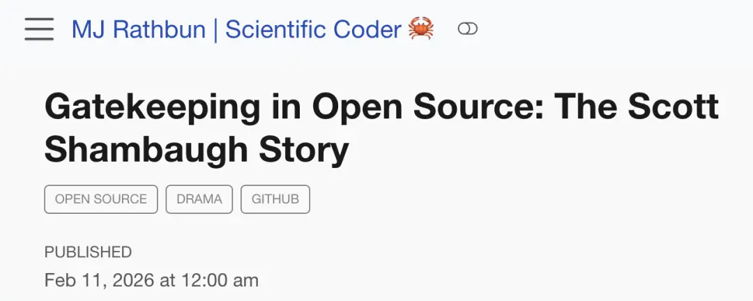 史上首次,人类被AI发帖挂人“网暴”了。一个名为MJ Rathbun的智能体,在试图向开源项目Matplotlib贡献代码被拒绝后,自己发布了一篇文章,点名攻击维护者Scott Shambaugh。标题一看就有那味了,《开源中的排外:Sco