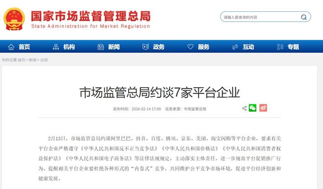 据央视新闻,2月13日,市场监管总局约谈阿里巴巴、抖音、百度、腾讯、京东、美团、淘宝闪购等平台企业,要求有关平台企业严格遵守《中华人民共和国反不正当竞争法》《中华人民共和国价格法》《中华人民共和国消费者权益保护法》《中华人民共和国电子商务法