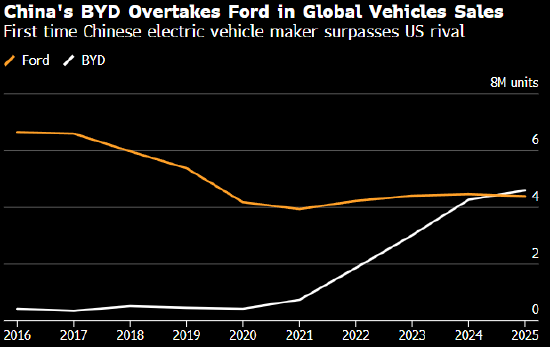 福特汽车公司去年的全球汽车销量首次输给了比亚迪,后面这家中国公司在全球最大汽车制造商中的排名继续攀升。福特汽车去年的批发销量下降近2%,略低于440万辆,这低于比亚迪1月份公布的460万辆的销量。这家美国汽车制造商周二公布的数据证实,比亚迪