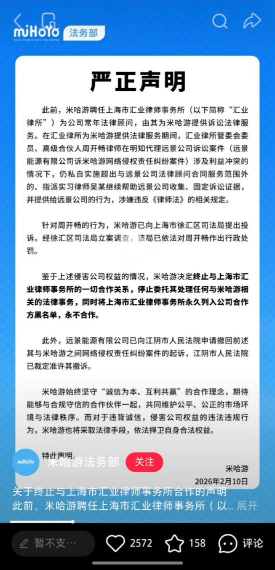 今日,米哈游法务部官方发布严正声明称,针对上海市汇业律师事务所管委会委员、高级合伙人周开畅的相关违法行为,米哈游已向上海市徐汇区司法局提出投诉。并终止与上海市汇业律师事务所的一切合作关系,官方声明内容如下: 阅读全文