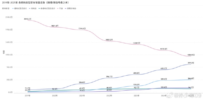 昨天,博主“孙少军09”发文分享了桑之未的两张2019-2025年新车能源形式销量走势图。从销量数据来看,2019年至2025年,中国汽车市场结构发生显著变化,汽油车销量持续下滑,六年时间里累计减少超过1000万辆,降幅接近50%。 阅读全