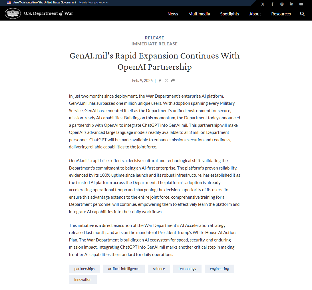 据报道,美国“战争部”(国防部)将与 OpenAI 合作,将ChatGPT集成到该机构的通用人工智能平台GenAI.mil中。美国战争部在最新声明中写道:“此次合作将使OpenAI先进的大型语言模型能够便捷地供战争部所有300万人员使用。C
