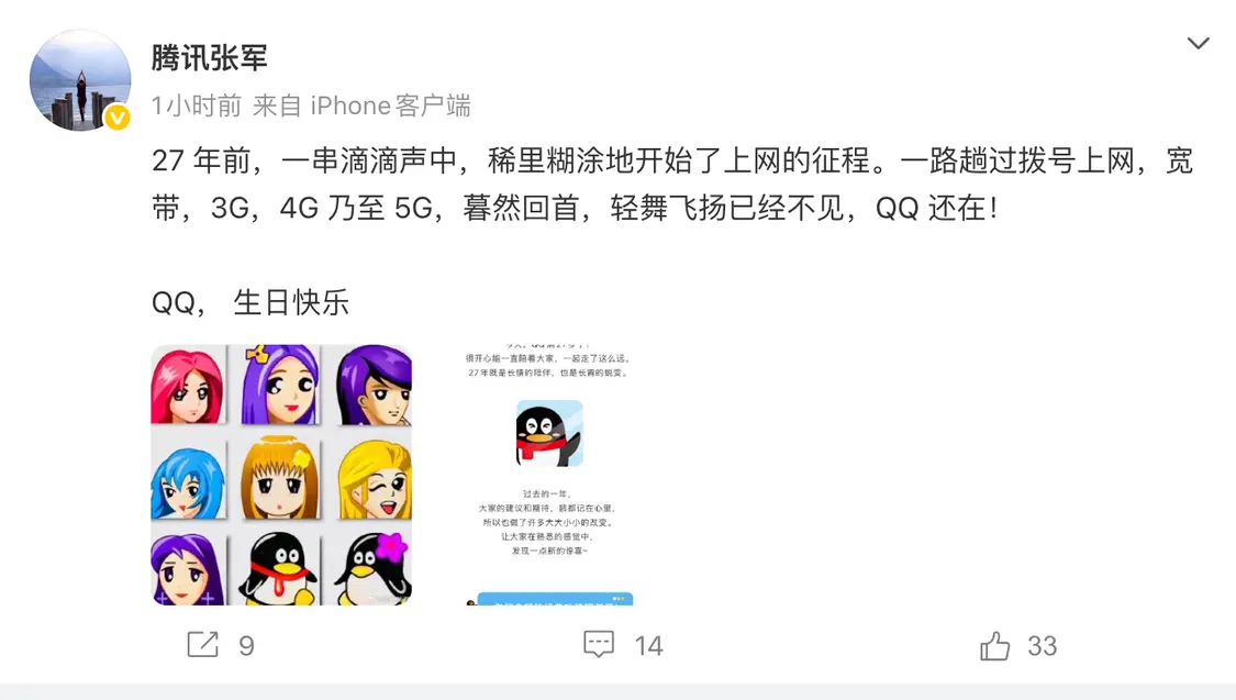 2月10日,腾讯QQ迎来其诞生后的第27个年头。腾讯公司公关总监张军也发文庆祝QQ上线27周年纪念日,并祝福QQ生日快乐。张军表示,“27年前,一串滴滴声中,稀里糊涂地开始了上网的征程。一路趟过拨号上网,宽带,3G,4G乃至5G,暮然回首,