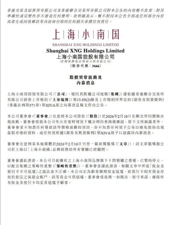今天晚间,在港上市的小南国公告,公司目前拥有的“上海小南国”品牌旗下十家餐厅的运营已暂时停止,以配合战略性重整。公告称,此前有文章中称“押金及预付卡不可退还”的说法并不正确,公司正在为顾客办理押金退还事宜,而预付卡的资金已存放于指定的保证金