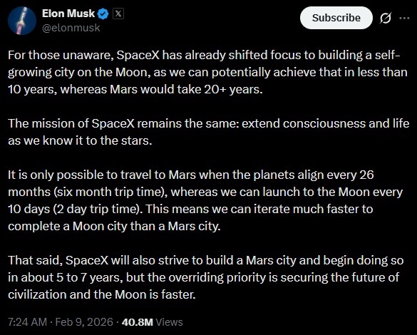 马斯克于当地时间周日晚间在社交媒体上发表长文,表示SpaceX的发展方向由火星殖民转向月面永久基地:“SpaceX已改变工作重心,目标是在月球建立一座有自持力的城市,实现该目标也许用不了十年,而火星基地要花不止二十年。” 阅读全文