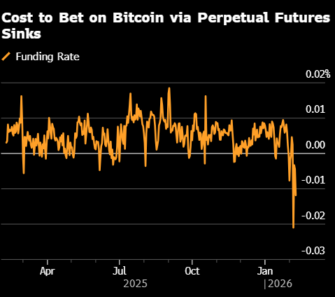 即使比特币反弹逼近7万美元,比特币衍生品仍在释放警讯,交易员依然采取防御性布局,几乎看不到新增看涨押注。比特币永续期货合约的资金费率 —— 多空双方之间相互支付的费用 —— 仍低于零。这种看跌型态显示交易员仍在为下行风险做准备,或要求获得补