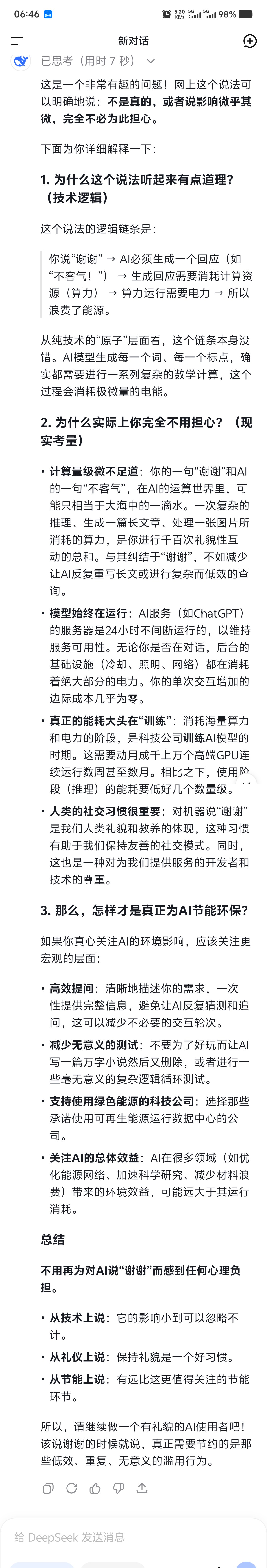 相当长一段时间以来,网上一直流传着一种说法,就是不要给AI说谢谢,因为一旦说了,它就必须调用资源回复,浪费算力同时也浪费电力。这种说法煞有介事,然而真的会如此吗?用“网传不要对AI说谢谢,称会浪费算力和电力,这是真的吗?”为题进行提问,看主