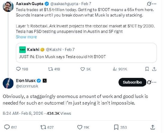 埃隆·马斯克周末表示,特斯拉公司的市值有朝一日有望达到 100 万亿美元,但需要付出巨大的努力并投入大量资金。此番言论是在投资者提出如果他旗下的各项业务能够合并的话,这一天文数字有可能实现之后发表的。 阅读全文