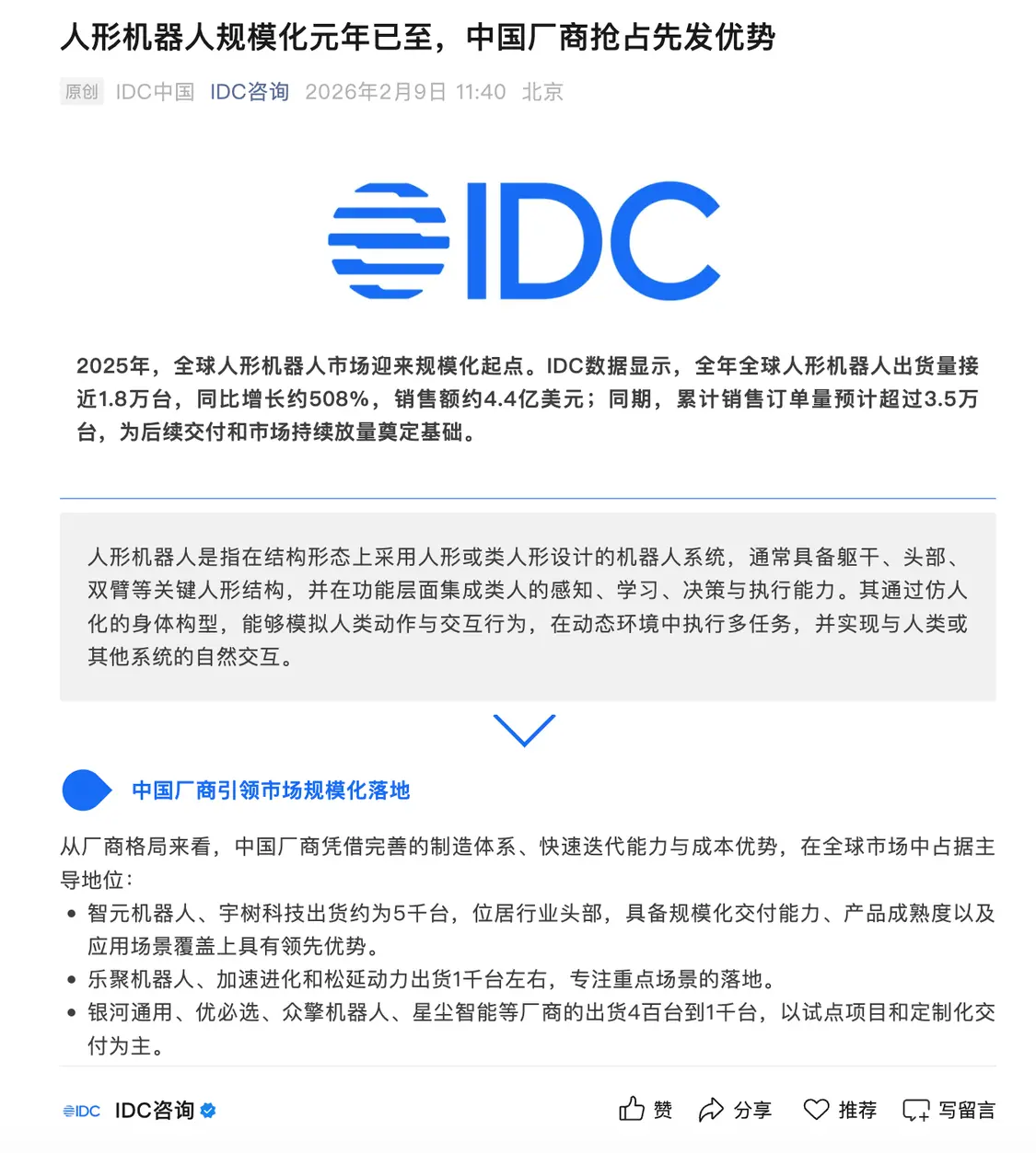 2月9日,根据IDC最新数据,2025年全球人形机器人出货量接近1.8万台,同比增长约508%,市场规模约为4.4亿美元。同期累计订单量预计超过3.5万台。从厂商格局看,中国企业在出货量上占据主导。 阅读全文