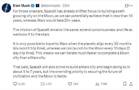 马斯克在X上发帖称:“对于那些不了解情况的人来说,SpaceX 已经将重点转向在月球上建造一个能够自我生长的城市。我们有可能在不到 10 年的时间内实现这一目标,而要实现火星计划则需要 20 年以上的时间。 阅读全文