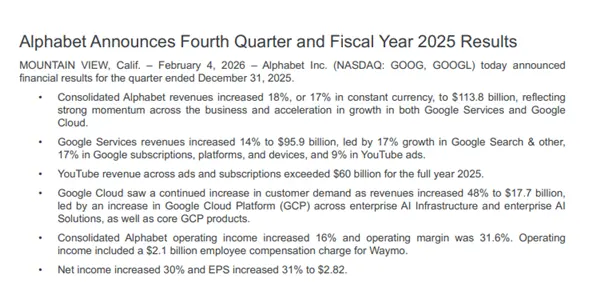 AI到底能不能赚钱?给AI烧钱是不是太多了?稍微看点AI圈新闻的差友们心里,肯定有上面这两个嘀咕。但就在前两天,Google的母公司Alphabet(为了方便后续阅读,仅以Google替代)发布了最新的四季度财报,再次把AI悲观论者的脸给打