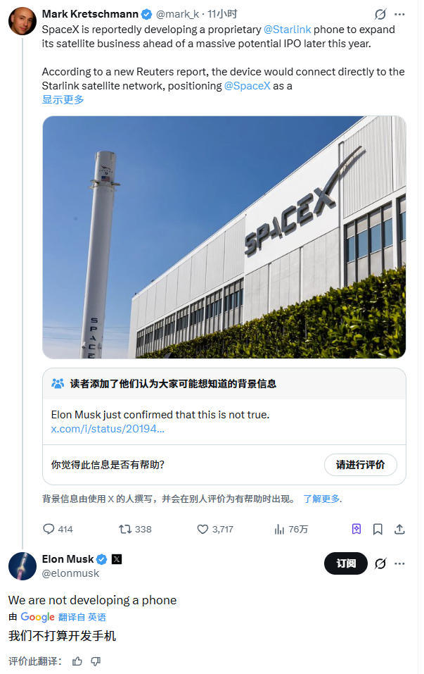 2月6日,针对路透社SpaceX将推出“星链手机”的报道,SpaceX首席执行官埃隆·马斯克(Elon Musk)在社交平台X上进行了辟谣,明确表示公司并未研发此类硬件产品。 阅读全文