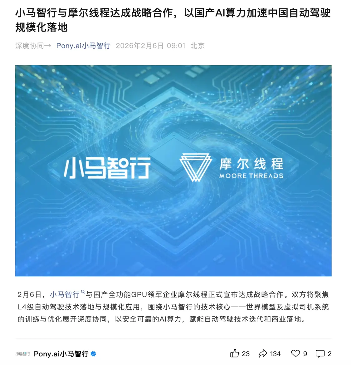 2月6日,小马智行与国产GPU企业摩尔线程于2月6日宣布达成战略合作,双方将聚焦L4级自动驾驶技术的规模化应用。此次合作的核心在于,小马智行将首次在其世界模型及虚拟司机系统的关键训练与仿真环节,规模化应用摩尔线程提供的国产AI算力。 阅读全