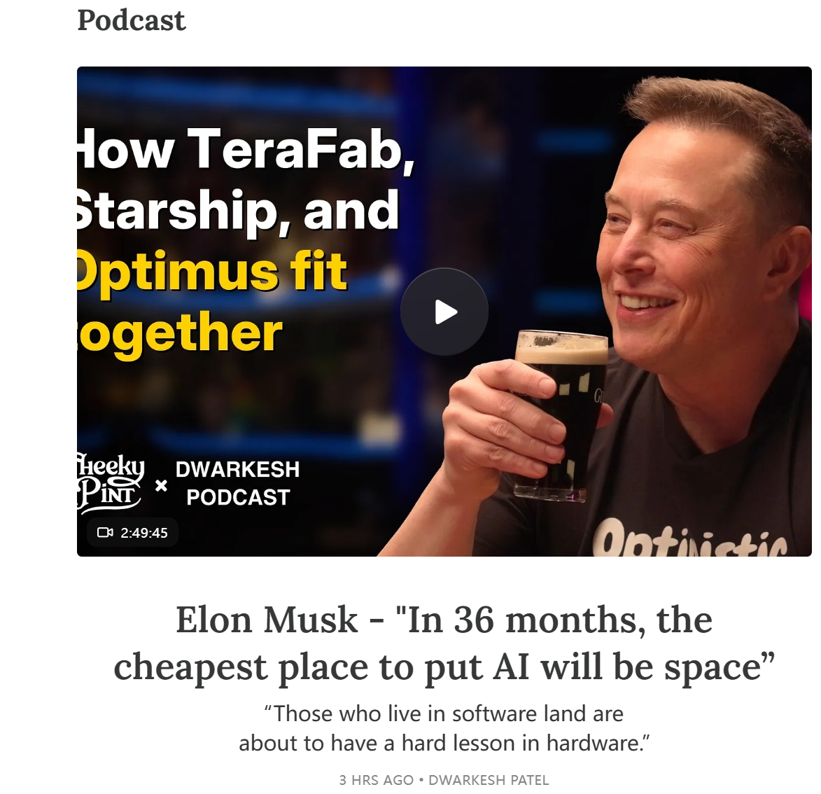 北京时间周五凌晨,马斯克作客知名科技访谈播客Dwarkesh Podcast的节目上线。作为全球资本市场热点话题的“太空GPU”,又获得世界首富的重点阐述。 阅读全文