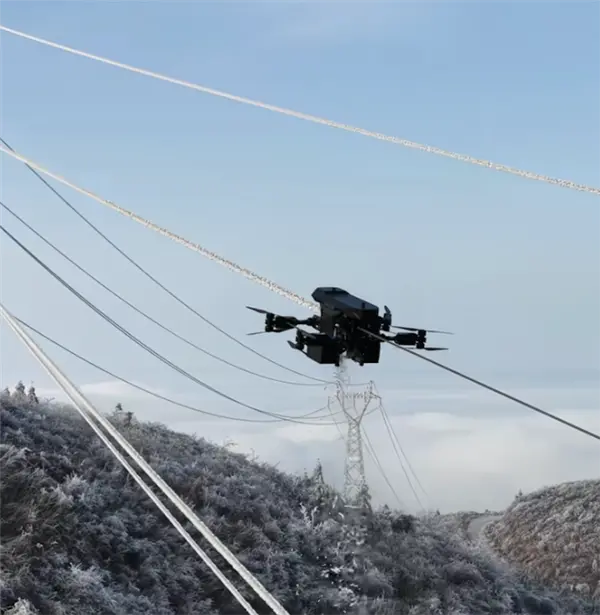 据人民日报报道,近日,第三代飞行除冰机器人 (KICE-500型) 在湖南张家界慈利县海拔1000米的110千伏天市线完成首次实战应用。该机器人由国网湖南省电力公司研发,将飞行平台与除冰机构深度融合,无需无人机辅助,一键启动即可实现从空中部