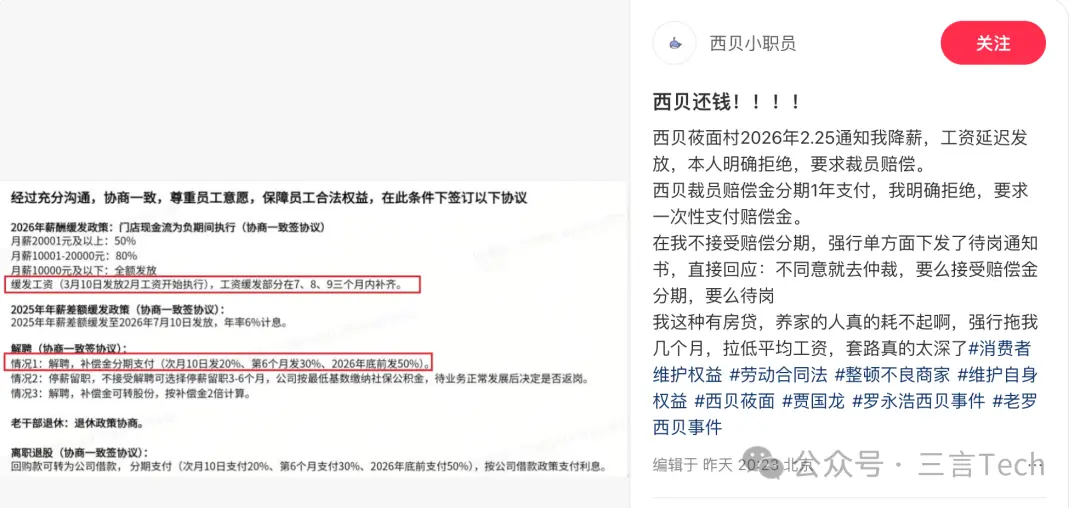 3月3日,有自称西贝北京员工的网友称,2月25接到降薪通知,工资延迟发放,在明确拒绝后,公司要求裁员赔偿。但裁员赔偿金要分期1年支付,员工再次拒绝,要求一次性支付赔偿金,最后公司下发了待岗通知书,并且表示“不同意就去仲裁,要么接受赔偿金分期