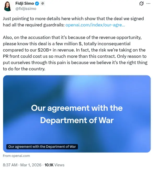 就在刚刚,奥特曼摊牌了:我们已经签约五角大楼,而且营收超过200亿。一夜之间,OpenAI被千夫所指,全网掀起ChatGPT卸载潮!昨日,奥特曼宣布与美国国防部(现更名为Department of War,即战争部,DoW)达成合作。 阅读