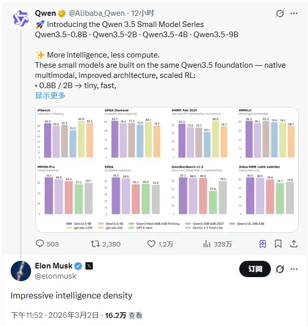 近期,阿里开源三款中等规模的新模型,包括Qwen3.5-35B-A3B、Qwen3.5-122B-A10B、Qwen3.5-27B。基于架构创新和训练突破,此次开源的三款千问3.5模型均创下中等尺寸模型的性能新高,这引发了市场关注,马斯克对