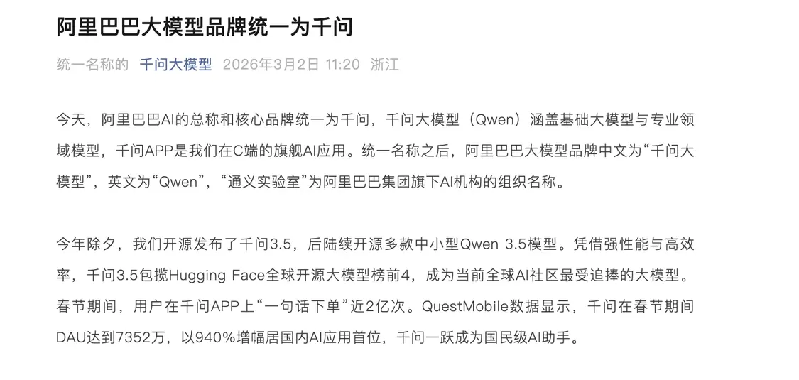 3月2日,千问大模型官方宣布,阿里巴巴正式将旗下AI业务总称及核心品牌统一整合为“千问”(英文名Qwen)。此次业务梳理后,千问大模型将作为涵盖基础模型与专业领域模型的统一名称,千问APP被确立为面向C端的旗舰应用,而通义实验室则明确为阿里
