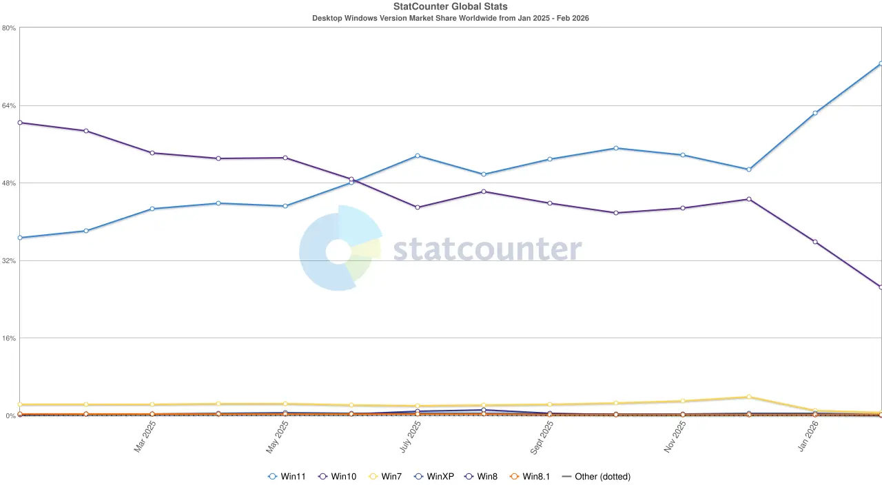 网站分析服务机构 Statcounter 公布的最新数据显示,2026 年 2 月,Windows 11 在全球桌面系统中的市场份额出现大幅跃升,再次录得“异常级”的单月增长。数据显示,Windows 11 的份额从 1 月的 62.41%