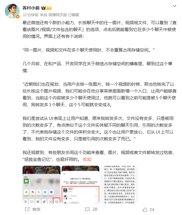 微信近期上线的图片使用次数查询功能引发用户关注。对此,微信员工“客村小蒋”作出回应,该功能的推出是为了让用户直观看到文件的使用情况,明确转发图片、视频或文件不会重复占用手机存储空间,从视觉层面缓解大家的存储焦虑。 阅读全文