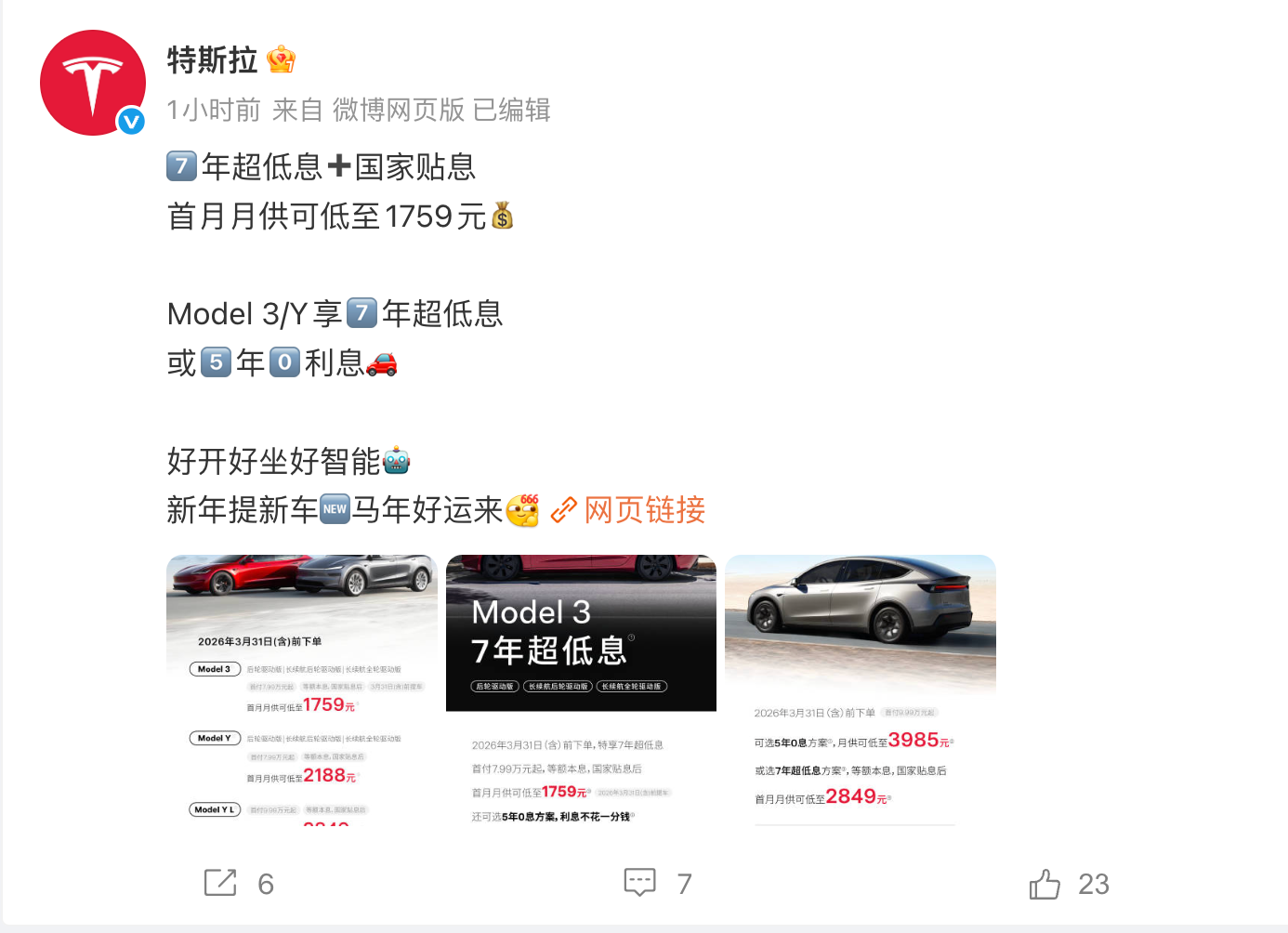 2月26日,特斯拉中国官宣,在3月31日前下单,全系车型均可享受7年超低息贷款。具体来看,Model 3首付7.99万起,月供可低至1759元;Model Y首付7.99万起,月供可低至2188元;Model Y L首付9.99万起,月供可